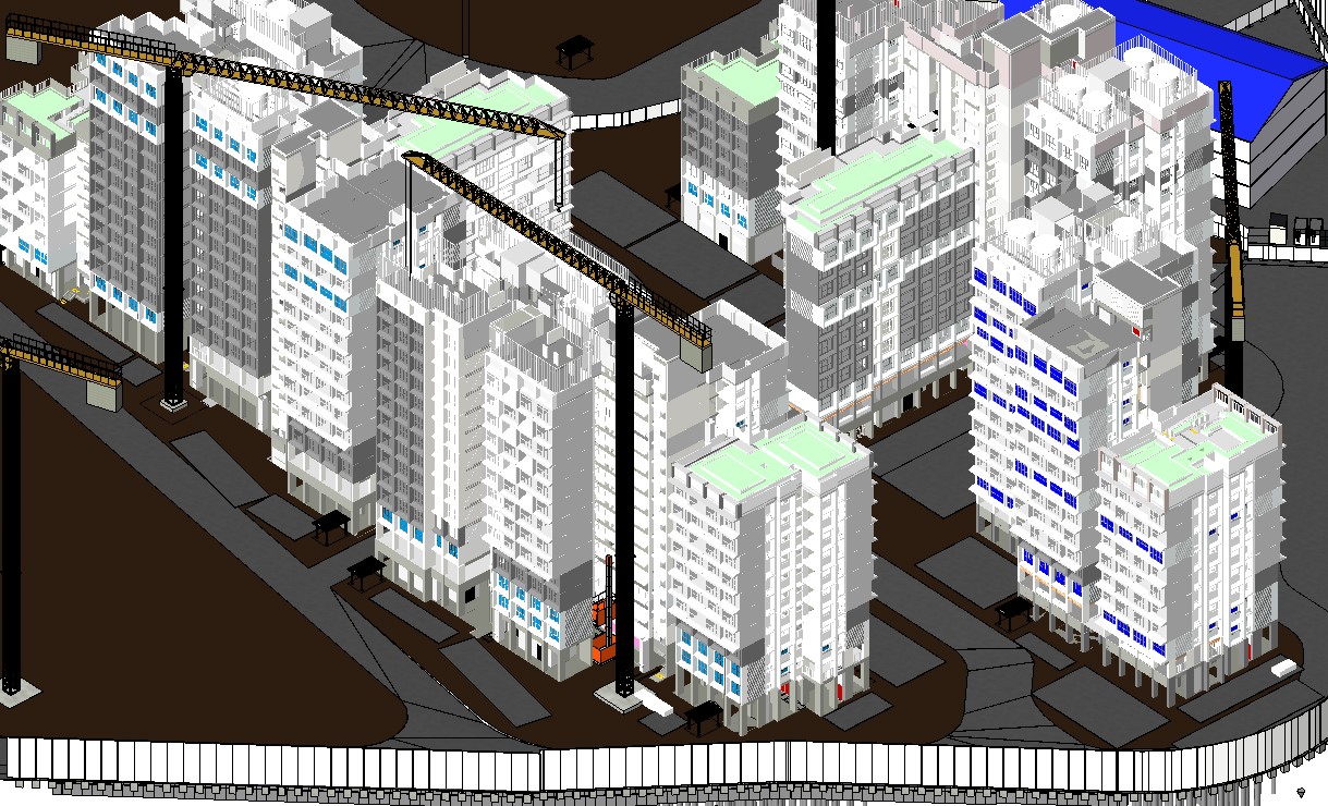 A model to indicate traffic movement, site drainage plans, cleaning stations, guard posts, site office, tower cranes and other temporary site related elements.